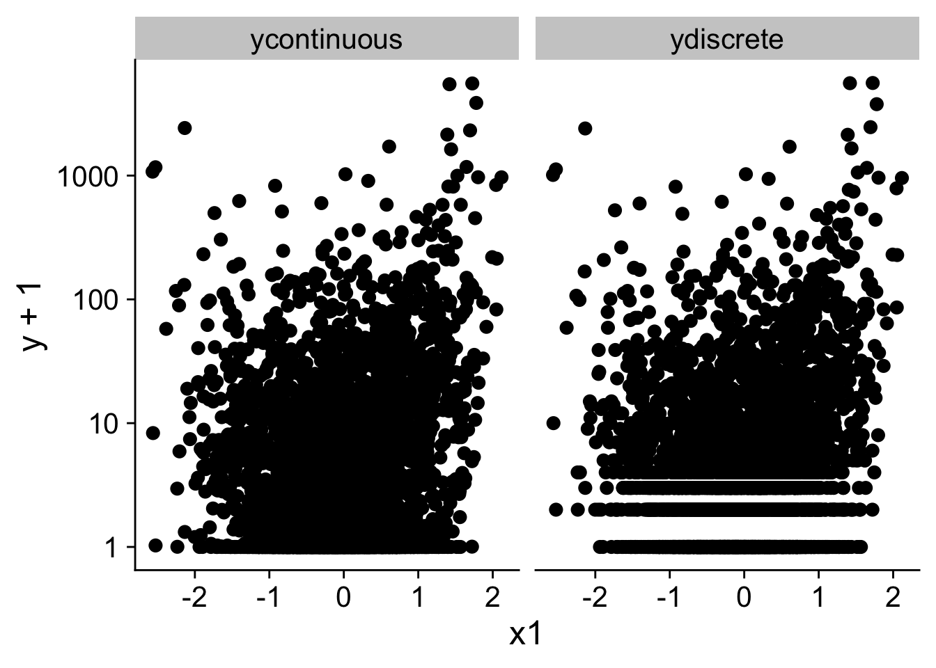 plot <- panel %>%pivot_longer(c(ydiscrete, ycontinuous), values_to ="y") %>%ggplot(mapping =aes(y = y +1, x = x1)) +geom_point() +scale_y_log10() +facet_wrap(~name)print(plot)