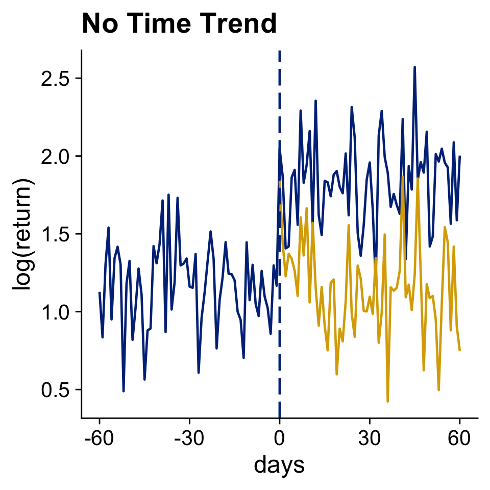 rd_did3_panel <-tibble(firm =rep(1:N, each = T),time =rep(1:T, times = N)) %>%left_join(rd_did3_firm, by ="firm") %>%mutate(# When will firms report?report =case_when( time ==1~0, time ==2& performance < cutoff2 ~0, time ==3& performance < cutoff3[1] ~0,TRUE~1),noise =rnorm(T*N, 0, 5),profit_no_report = firm_effect + noise +case_when( time ==1~ profit1, time ==2~ profit2[1], time ==3~ profit3[1] ),profit_report = firm_effect + noise +case_when( time ==1~ profit1, time ==2~ profit2[2], time ==3& performance < cutoff3[2] ~ profit3[2],TRUE~ profit3[3] ),actual_profit =ifelse(report ==1, profit_report, profit_no_report) )